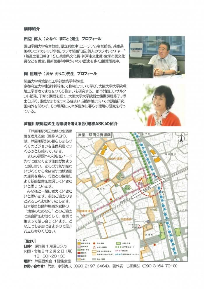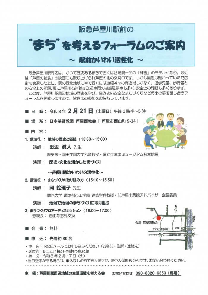 このたび、芦屋川駅周辺地域の歴史を学び、住みよく安全なまちづくりの将来像について語り合うフォーラムを開催いたします。